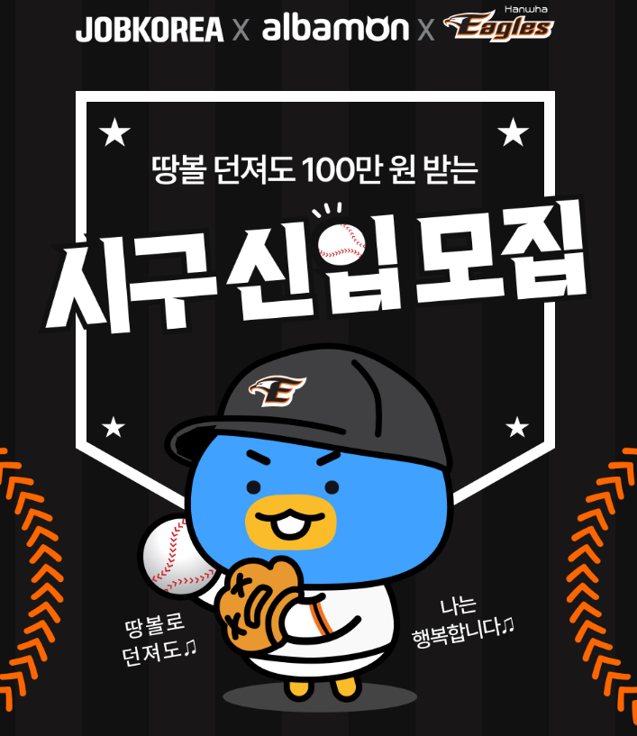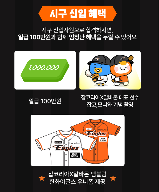 이 알바의 가장 큰 매력은 무엇보다도 일급 100만원을 받을 수 있다는 점이겠죠? 하지만 그것만이 전부가 아닙니다. 합격자에게는 잡코리아X알바몬 엠블럼이 새겨진 한화이글스 유니폼도 제공된다고 해요. 야구장에서 직접 유니폼을 입고 시구와 시타를 한다니 상상만 해도 가슴이 설레는데요.