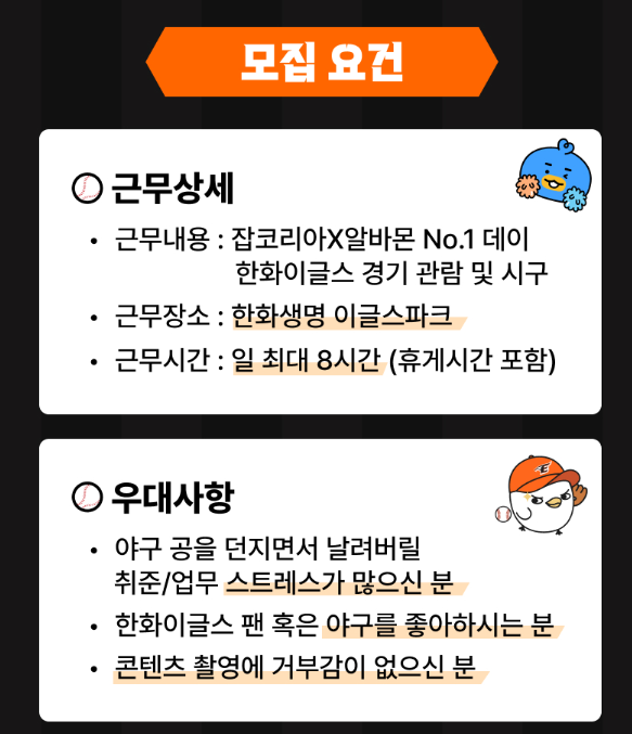 지원 자격에는 특별한 제한이 없습니다. 야구에 관심이 있거나 직접 경기에 참여해보고 싶은 분이라면 누구나 환영이에요. 다만 야구공을 던지면서 그동안 쌓인 스트레스를 해소하고 싶은 취준생이나 직장인, 그리고 한화이글스의 열혈 팬들에게는 가산점이 있다고 하니 참고하시기 바랍니다.